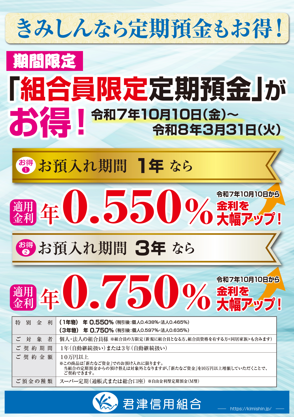 2025年10月10日(金)より期間限定「組合員限定定期預金」の金利改定を行います。