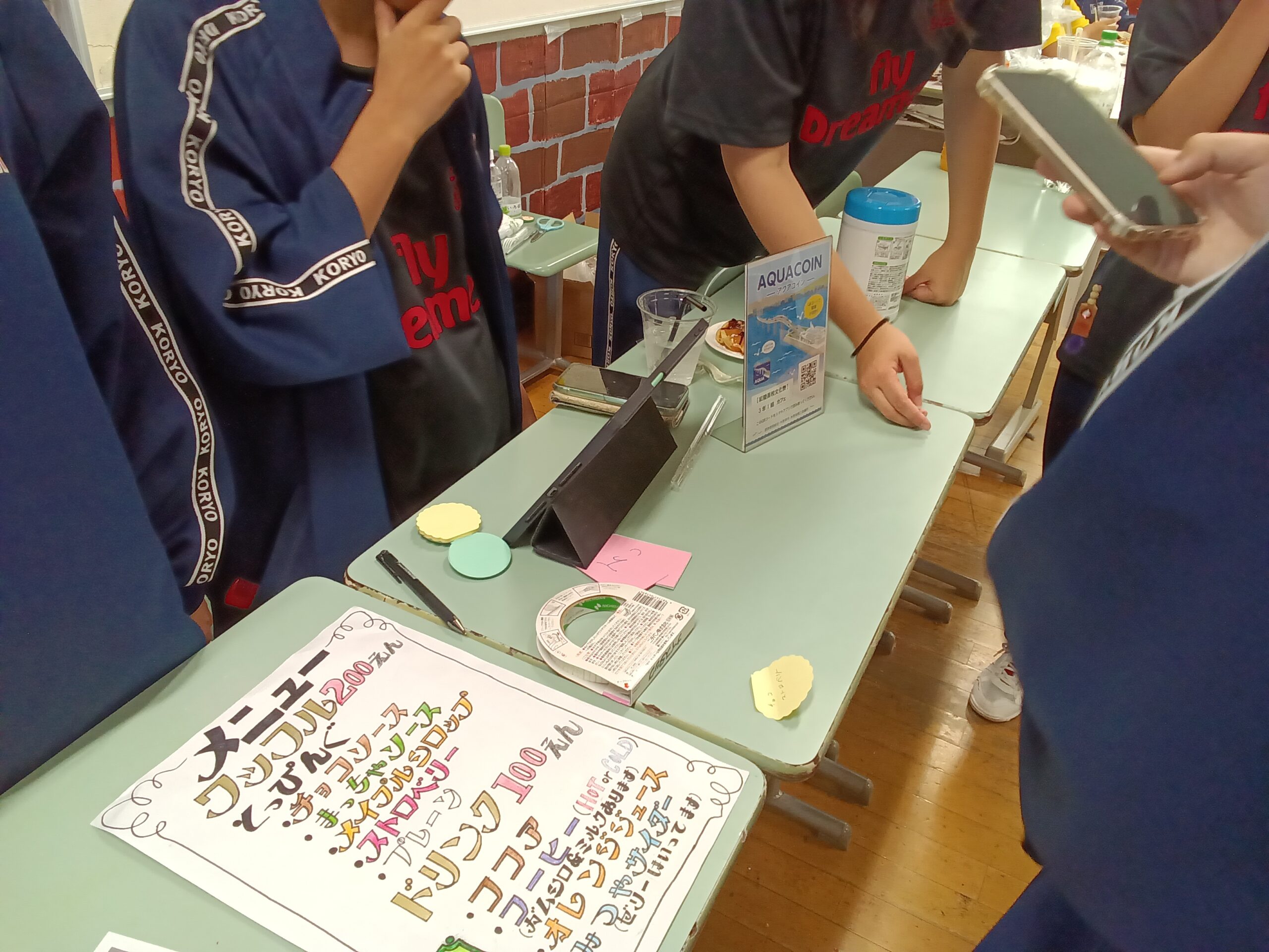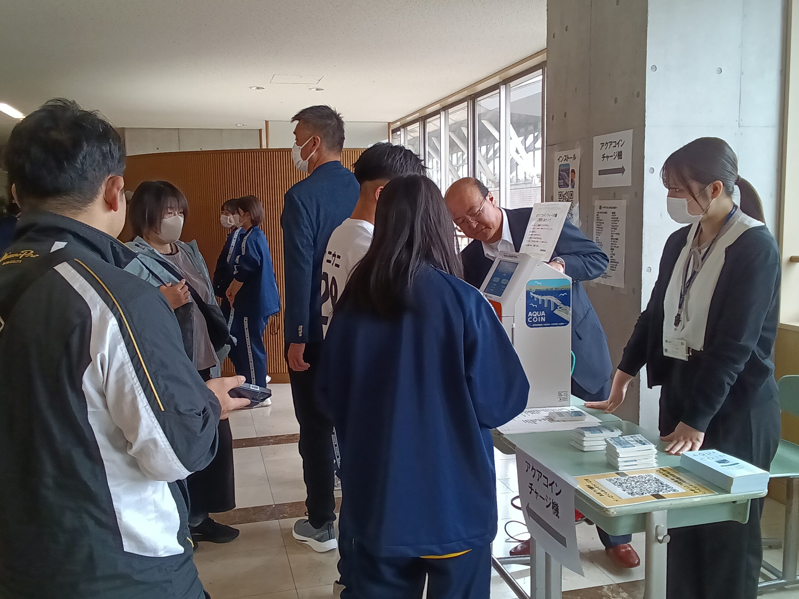 対象は決済を伴う模擬店7店舗で、当日は会場内2か所にアクアコインブースを設置しました。